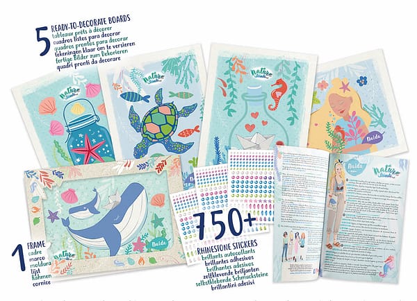 Conteúdo: 5 quadros prontos para decorar, 750+ brilhantes adesivos, 1 moldura.